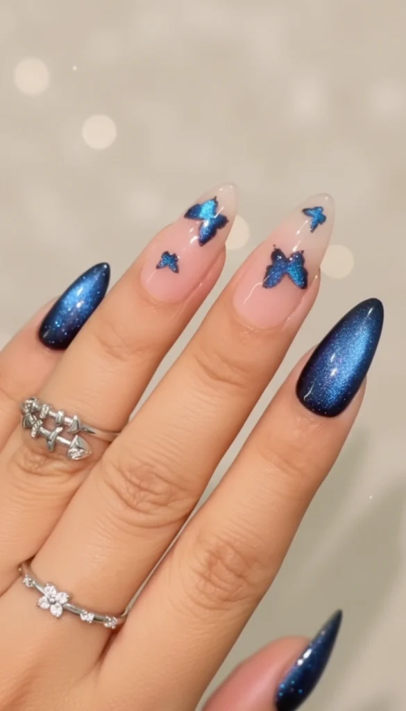 These nails combine a deep, shimmering blue cat-eye effect with soft nude bases and delicate butterfly accents for a dreamy, night-sky vibe. The almond shape keeps the look elegant, while the glittery chrome finish and raised butterfly details add dimension and movement.