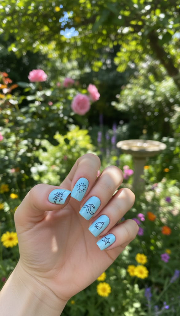 A simple blue base paired with thin white or neutral lines adds personality without visual clutter. The design feels creative but controlled, making it suitable for everyday wear. This option shows how Blue Summer Nails can feel expressive while staying practical.